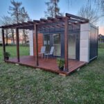 Vybaven koupelnou, která zajišťuje plný komfort i při delším pobytu, a dřevěnou terasou z sibiřské borovice – odolné vůči povětrnostním podmínkám a mimořádně estetické.